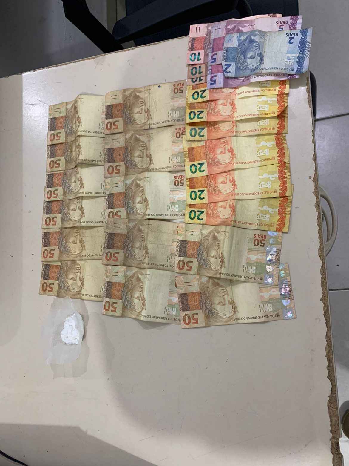 Com o outro masculino, foi localizado várias notas de dinheiro totalizando R$ 812,00 e não soube informar com clareza de onde arrumou o dinheiro. Cabe salientar que o mesmo já foi conduzido por posse de droga pela guarnição dias atrás no mesmo local.