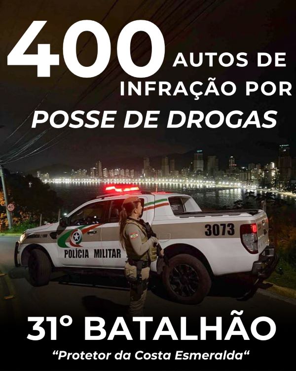 O 31º Batalhão de Polícia Militar (31º BPM), sediado em Itapema, já registrou mais de 400 autos de infração por porte de entorpecentes em locais públicos desde o início da vigência da lei estadual que prevê a responsabilização administrativa para esse tipo de conduta. O número evidencia a atuação contínua das guarnições na fiscalização e no cumprimento da legislação.