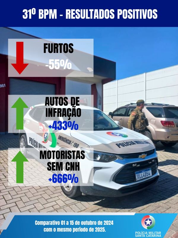 Os resultados demonstram o compromisso do 31º Batalhão de Polícia Militar com a segurança da população, atuando de forma estratégica e integrada tanto na repressão à criminalidade quanto na prevenção de delitos e infrações, por meio do policiamento ostensivo e do trabalho contínuo de inteligência.