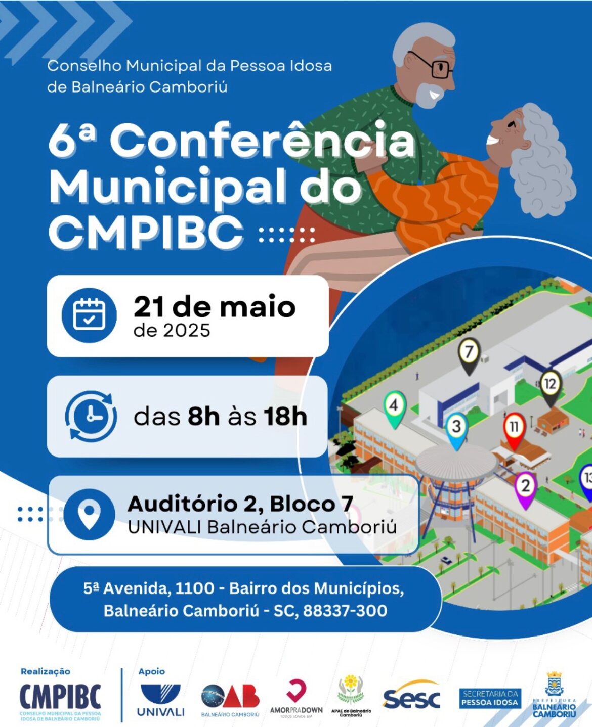 A 6ª Conferência Municipal dos Direitos da Pessoa Idosa de Balneário Camboriú será realizada nesta quarta-feira (21), no auditório da Universidade do Vale do Itajaí (Univali), campus Balneário Camboriú. O evento ocorre das 8h às 18h, com organização do Conselho Municipal da Pessoa Idosa e apoio da Secretaria da Pessoa Idosa (SPI).