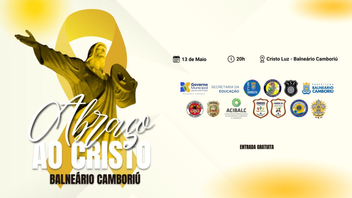 A Prefeitura de Balneário Camboriú, através da Autarquia Municipal de Trânsito (BC Trânsito), realiza, nesta terça-feira (13), às 20h, no Complexo Turístico Cristo Luz, o 8º Abraço ao Cristo, em celebração ao movimento mundial de conscientização no trânsito Maio Amarelo.