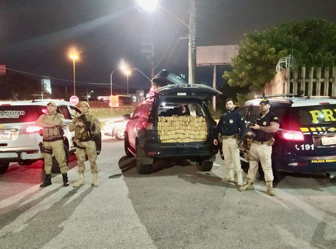 Policiais rodoviários federais e policiais militares apreenderam na noite deste sábado (25), em Balneário Camboriú, 1.004 quilos de maconha. Dois homens foram presos.