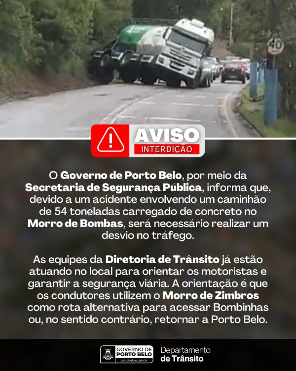 Um acidente registrado às 16h10 no Morro de Bombas levou ao bloqueio parcial da via e exigiu um desvio emergencial no trânsito. A ocorrência envolveu um caminhão carregado com 54 toneladas de concreto, segundo informações da Secretaria de Segurança Pública de Porto Belo.