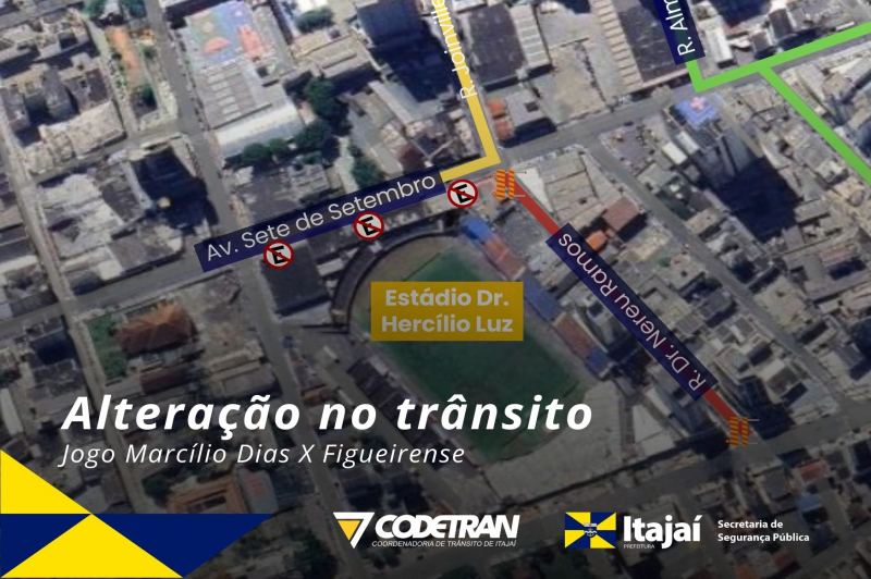 A Coordenadoria de Trânsito de Itajaí (Codetran) realizará alterações no tráfego de veículos no entorno do Estádio Dr. Hercílio Luz (Gigantão das Avenidas) nesta sexta-feira (13), em razão da partida entre Marcílio Dias e Figueirense, marcada para às 19h30.