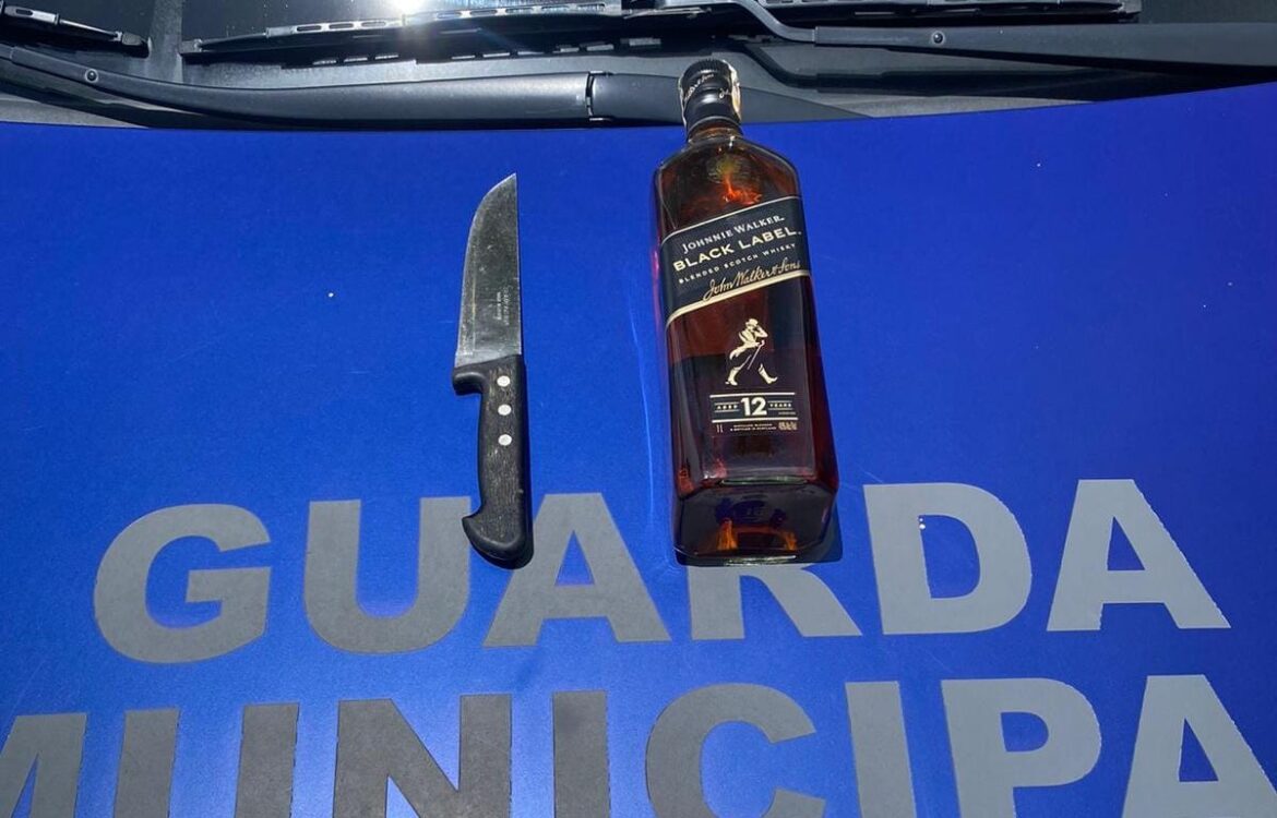Diante da situação, foi realizada a abordagem policial, encontrando com o suspeito um WHISKY JOHNNIE WALKER BLACK, de 1 (um) litro, e uma faca grande.