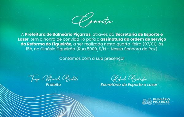 O prefeito de Balneário Piçarras, Tiago Baltt, assina nesta quarta-feira (07/01) a ordem de serviço que autoriza o início das obras de reforma do Ginásio Figueirão, localizado no bairro Nossa Senhora da Paz. O ato oficial será realizado às 15h, em frente ao ginásio, na Rua 5000.