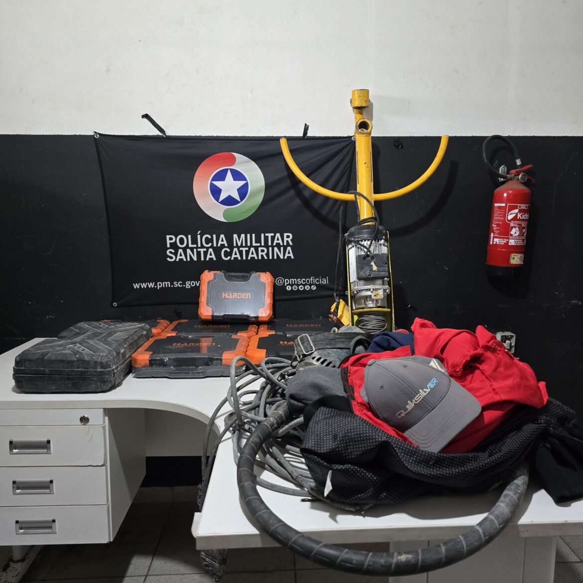Foram furtados kits de ferramentas Harden (maleta) e outros equipamentos, durante a madrugada, por volta das 02h40. A partir de diligências realizadas no local do crime, as guarnições PM conseguir identificar os autores e a casa onde estavam escondidos.