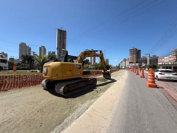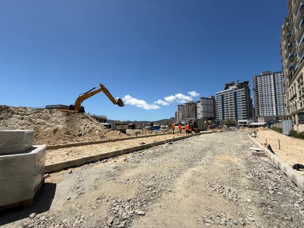 Ainda na região, segue em ritmo intenso a reurbanização da orla, entre as ruas 319 e 323B. A fase de drenagem está sendo finalizada, e o nivelamento do solo prepara o local para as próximas etapas, que incluirão pavimentação e revitalização do calçadão.