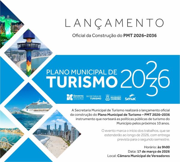 Balneário Camboriú se prepara para discutir seu novo Plano Municipal de Turismo (PMT) para o período 2026/2036. O evento de lançamento do processo de construção do novo PMT é aberto ao público e será nesta terça-feira (17), às 9h, no plenário da Câmara de Vereadores.