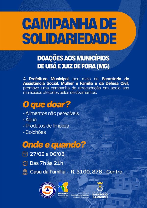 A Prefeitura de Balneário Camboriú, por meio da Secretaria de Assistência Social, Mulher e Família e da Defesa Civil, reforça a campanha solidária que está sendo promovida no município em prol das famílias atingidas pelas chuvas nas cidades de Juiz de Fora e Ubá (MG). Até a próxima sexta-feira (6), a prefeitura está arrecadando donativos para serem enviados às famílias mineiras.