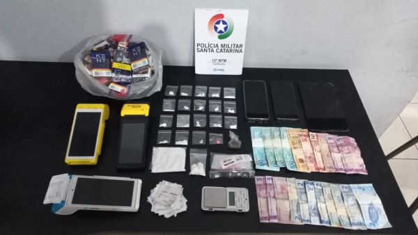 No total, foram apreendidos aproximadamente 76 gramas de cocaína, uma porção de maconha, um comprimido de ecstasy, R$ 516,00, três máquinas de cartão, diversas carteiras de cigarro vazias utilizadas para ocultar a droga e outros materiais relacionados à traficância.