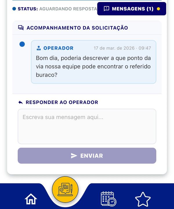 O chat é acionado apenas em caso de necessidade, pela equipe da Secretaria de Obras, que realiza a triagem das solicitações do app. Caso haja alguma inconsistência na requisição do morador (como imagem difícil de identificar, endereço errado ou divergências), o operador da requisição inicia a conversa para sanar possíveis dúvidas. Dessa forma, o usuário pode explicar com mais detalhes sobre o que é a demanda.