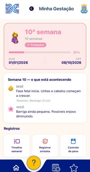 - Maternidade: espaço dedicado às gestantes, com informações sobre cada fase da gravidez, orientações sobre cuidados pré-natais e acompanhamento das etapas da gestação.