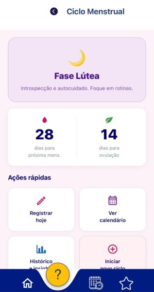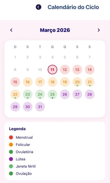 - Ciclo menstrual: ferramenta que permite registrar e monitorar o ciclo menstrual, auxiliando na compreensão dos períodos férteis, previsões de menstruação e possíveis alterações no ciclo.