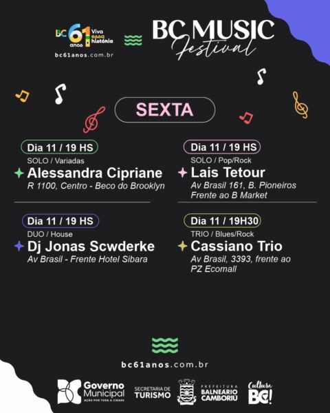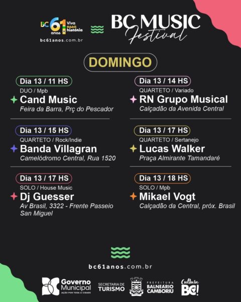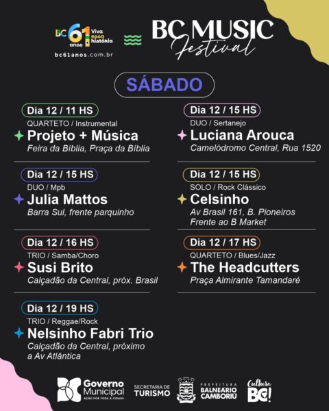 No sábado (12), serão realizadas sete apresentações do BC Music. A partir das 11h, haverá apresentação na Feira da Bíblia; às 15h na Barra Sul, Camelódromo e Avenida Brasil, no 161. Já às 16h, no Calçadão da Avenida Central, às 17h, na Praça Almirante Tamandaré e, às 19h, no Calçadão da Avenida Central.