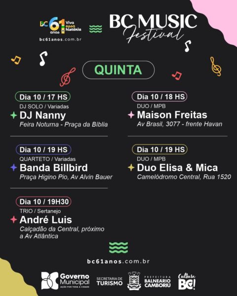 “O formato do BC Music tem despertado o interesse do público e agradou nossos artistas, que têm nos dado um retorno muito positivo. Ficamos felizes com a aceitação de um festival que criamos com muito carinho e vontade de agregar nossos talentos”, afirmou o secretário de turismo, Evandro Neiva.