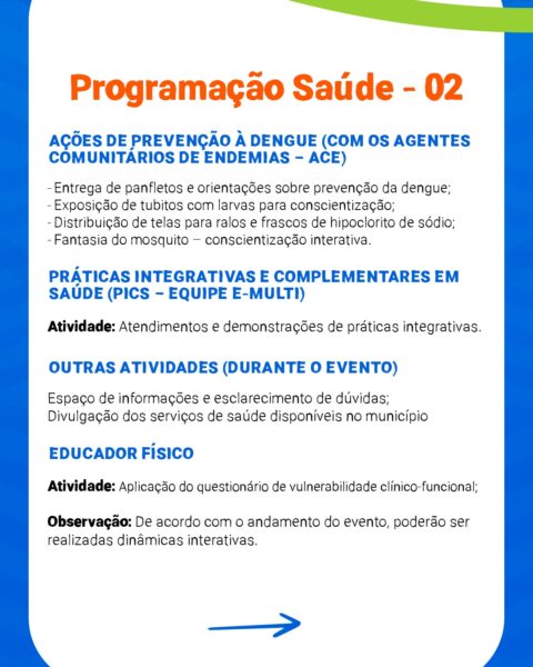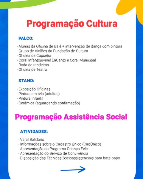 A programação foi elaborada para toda a família, com uma variedade de atividades nas áreas de saúde, educação, cultura, esporte, assistência e lazer, convidando moradores e visitantes a participarem de um dia repleto de vivências e integração.