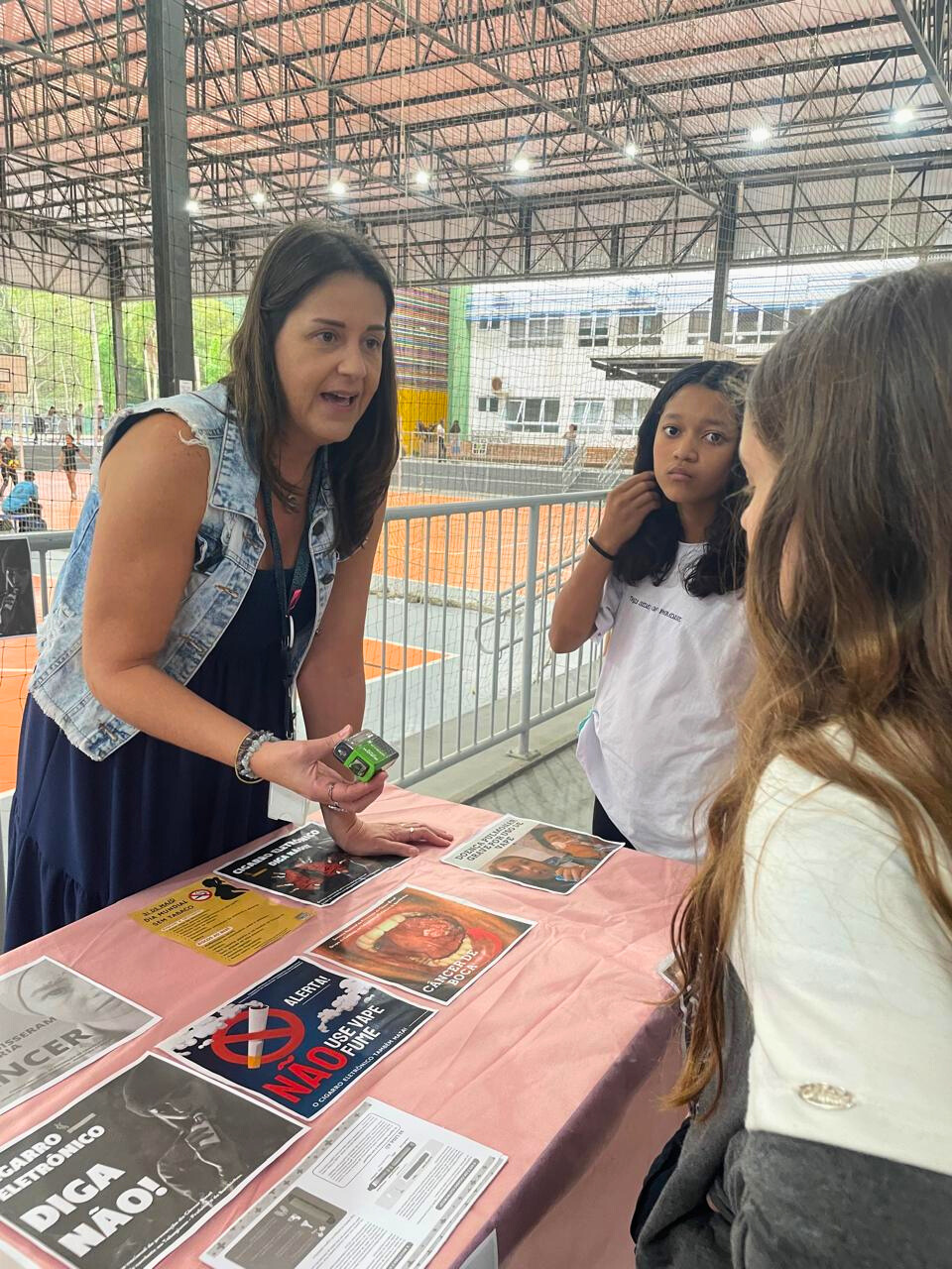 No dia 29 de maio, integrantes do Grupo de Combate à Cessação do Tabagismo de Bombinhas — formado pela nutricionista e coordenadora Karina Raschelli, a psicóloga Joyce Almeida e o profissional de educação física Alceny Neto — promoveram uma “blitz educativa” com o tema: “O pod? Não pode!”. A atividade, voltada para alunos do 6º ao 9º ano, integrou o Programa Saúde na Escola (PSE) e teve como objetivo principal alertar sobre os riscos associados ao uso de cigarros convencionais e eletrônicos, além de desconstruir as estratégias de marketing utilizadas pela indústria do tabaco.