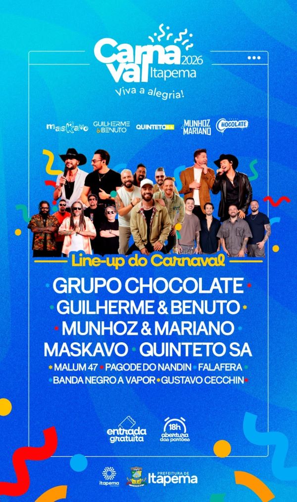 Itapema abre oficialmente nesta sexta-feira (13/02) a programação do Carnaval na Arena Viva Verão, na orla da Meia Praia, entre as ruas 307 a 313. A festa começa às 14h com o Carnaval da Pessoa Idosa, seguido pela abertura noturna às 19h com Pagode do Nandin e o show do Grupo Chocolate, que promete animar moradores e turistas já no primeiro dia.