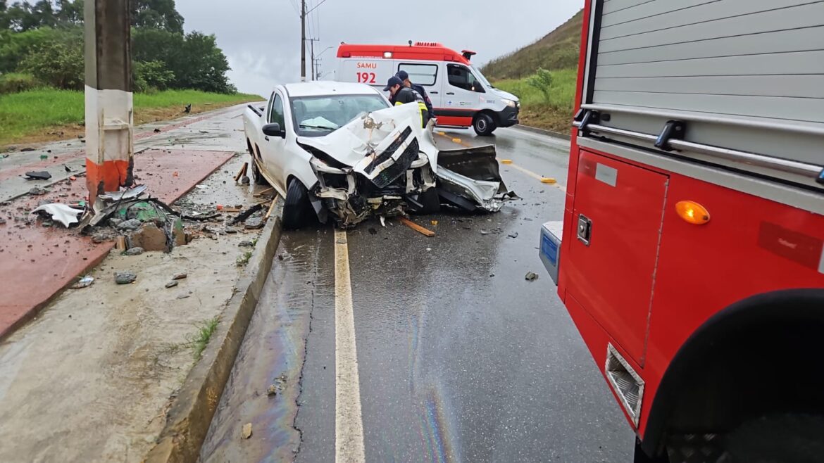 No local, segundo relatos, o CHEVROLET/MONTANA LS2, conduzido pelo homem, aquaplanou e rodou na pista, vindo a atingir o outro veiculo VW/PARATI 16V TOUR, conduzido pela mulher, e posteriormente um poste da CELESC da via, deixando o mesmo com risco de queda.
