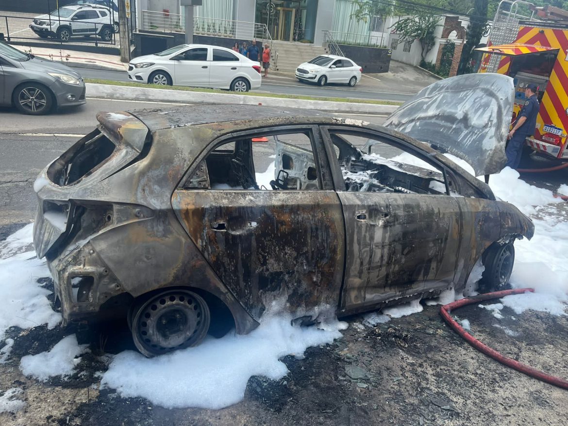 Guarnição conversou com o proprietário do carro, um homem de 21 anos, o qual relatou que estava transitando com o veículo HYUNDAI/HB20 pela Avenida dos Estados, próximo ao numeral 769, quando começou a sentir um cheiro de queimado vindo da saída de ar do ar condicionado. Que estava trabalhando como motorista de aplicativo e imediatamente saiu do veículo juntamente com a passageira. Que logo após, o veículo explodiu. Que não sabe o que pode ter acontecido, pois a manutenção do veículo estava em dia.