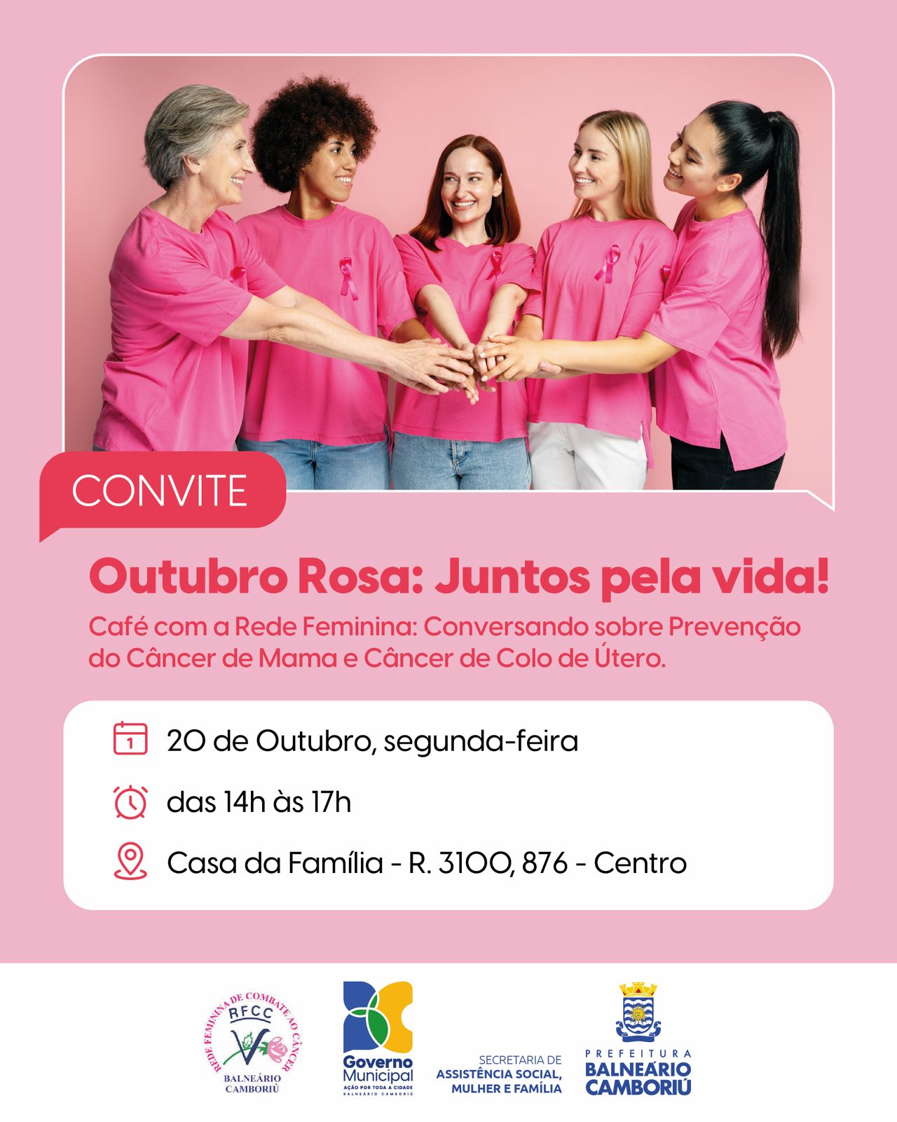 A Prefeitura de Balneário Camboriú, por meio da Secretaria de Assistência Social, Mulher e Família, promove, nesta segunda-feira (20), das 14h às 17h, o encontro Outubro Rosa: juntos pela vida. O evento, aberto à comunidade, acontece na Casa da Família (Rua 3100, 876 – Centro) com a participação da Rede Feminina de Combate ao Câncer da cidade.