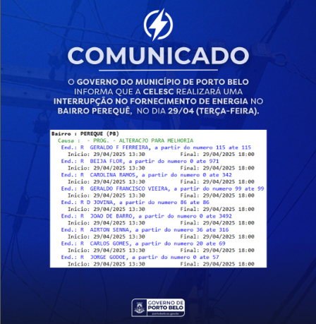 O Governo de Porto Belo informa que a CELESC realizará uma interrupção programada no fornecimento de energia elétrica no bairro Perequê, nesta terça-feira (29), das 13h30 às 18h.