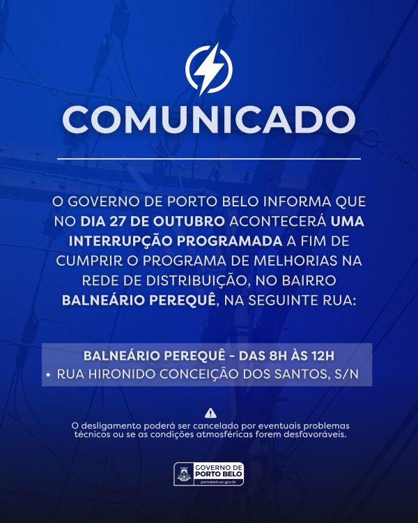 O Governo de Porto Belo informa que a CELESC realizará uma interrupção programada no fornecimento de energia elétrica no bairro Balneário Perequê, na próxima segunda-feira, dia 27/10, das 8h às 12h.