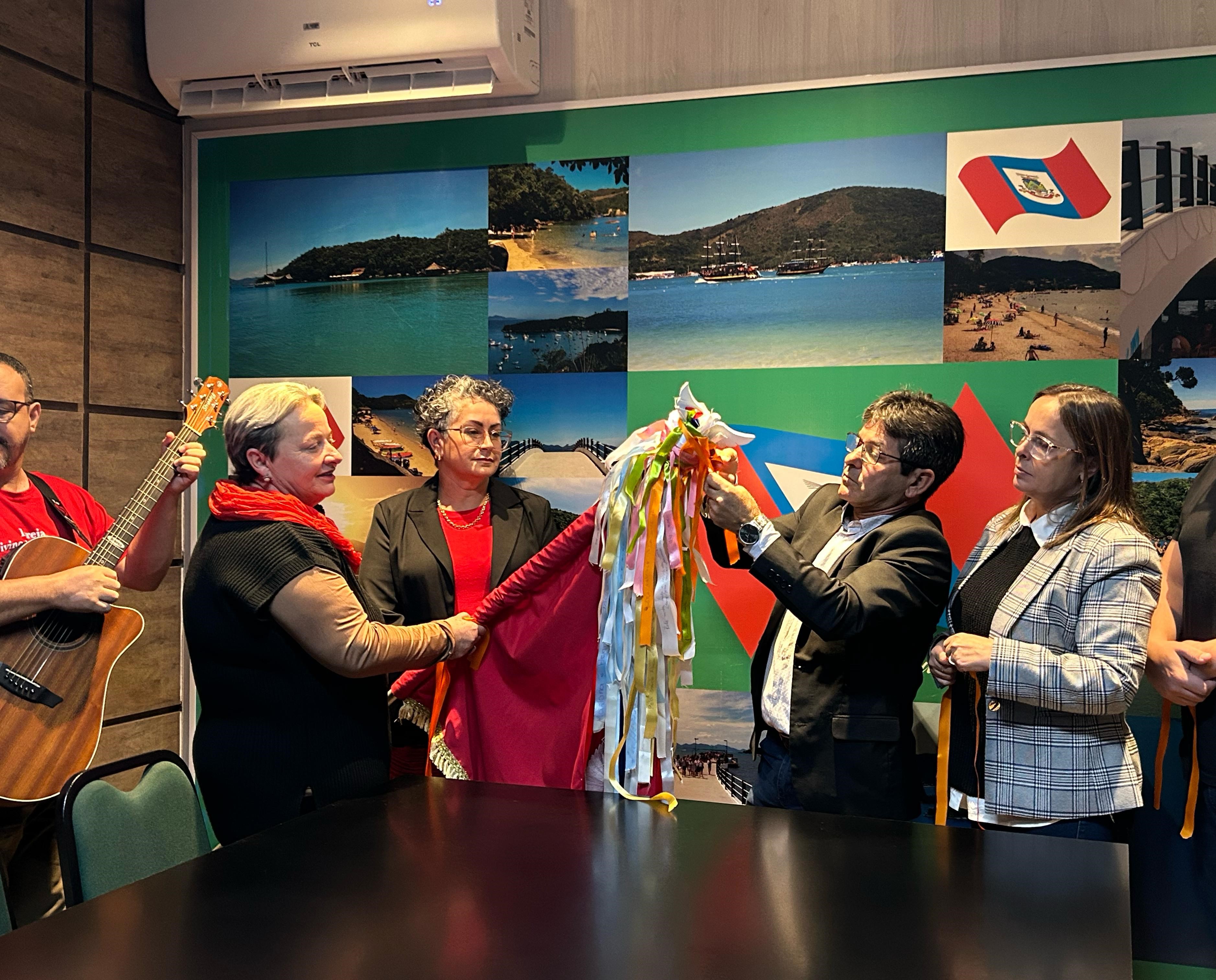 O Centro Administrativo de Porto Belo recebeu, na manhã desta segunda-feira (02), um momento especial e carregado de simbolismo a passagem da Bandeira do Divino Espírito Santo. A tradição, que antecede a Festa do Divino, celebra a fé e a cultura popular do município, mantendo viva uma das manifestações religiosas mais marcantes da cidade. A Bandeira foi apresentada por representantes da Capela Divino Espírito Santo e percorreu todos os setores do prédio, levada pelo prefeito Joel Orlando Lucinda.