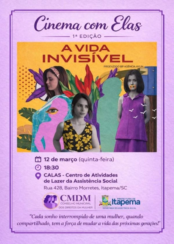 Em alusão ao Dia Internacional da Mulher, o Conselho Municipal dos Direitos da Mulher (CMDM), com apoio da Prefeitura de Itapema por meio da Secretaria de Assistência Social, promove no dia 12 de março a 1ª edição do Cinema com Elas, um encontro especial voltado à reflexão, ao fortalecimento feminino e à troca de experiências entre mulheres do município.