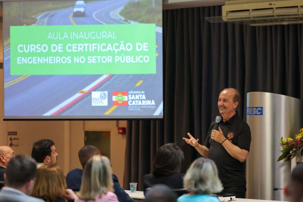 O Governo de Santa Catarina iniciou na noite deste domingo, 18, uma capacitação para 150 engenheiros e técnicos que atuam na Secretaria de Estado da Infraestrutura e Mobilidade (SIE). Com a qualificação, o Estado busca a excelência na execução de obras e serviços públicos. O governador Jorginho Mello participou da aula inaugural que ocorreu na Federação das Indústrias de Santa Catarina (FIESC) e destacou que a iniciativa é inédita e fundamental para garantir a eficiência do Governo na condução das obras de infraestrutura espalhadas pelo Estado.