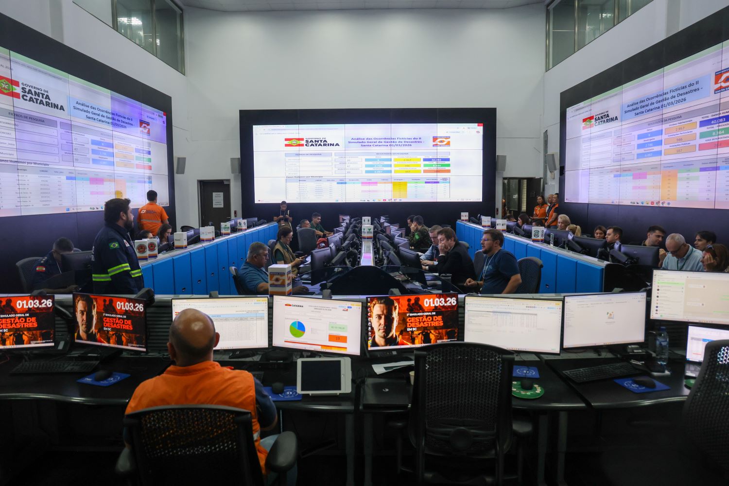 Desde as primeiras horas da manhã, o Estado operou em modo de resposta plena para testar protocolos, reforçar a prontidão das equipes e integrar a atuação entre municípios e estrutura estadual. As atividades começaram às 8h, nos municípios, com o registro e envio das primeiras ocorrências simuladas à estrutura estadual. Com isso, a abertura oficial ocorreu às 9h20, com o disparo de um alerta de emergência por Cell Broadcast, que alcançou simultaneamente celulares conectados às redes 4G ou 5G em todo o território catarinense.