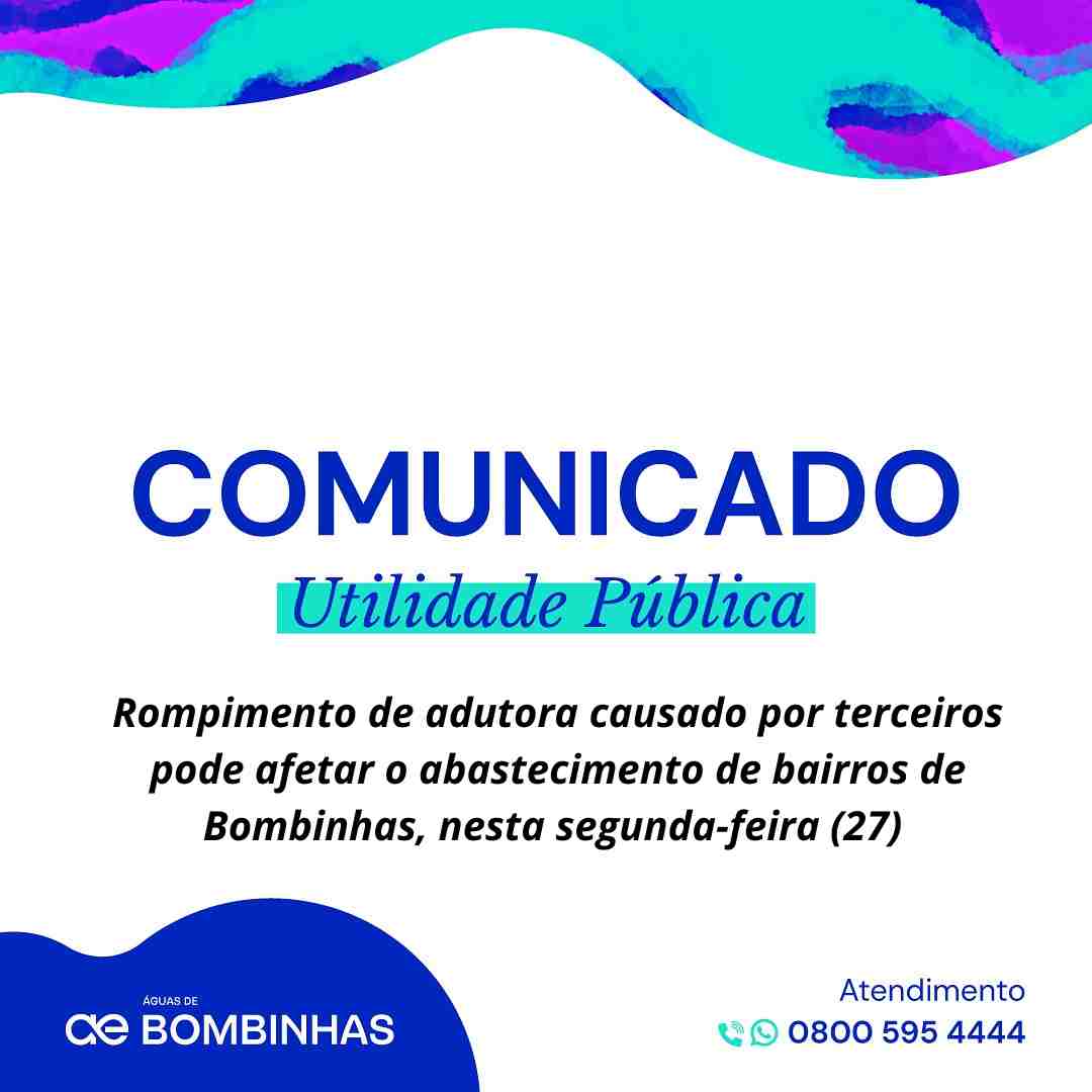 A Águas de Bombinhas informa que, devido ao rompimento de adutora em Zimbos, causado por terceiros, pode ocorrer precariedade no abastecimento nos bairros Zimbros, Mariscal e Canto Grande na tarde de segunda-feira (27).