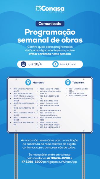 Acompanhe as informações sobre as obras nas redes sociais da Conasa Águas de Itapema: Instagram e Facebook @aguasdeitapema ou site www.aguasdeitapema.com.br. Em caso de dúvidas, entre em contato através de um dos canais de atendimento da Conasa: por telefone (47) 98404-8200 ou 115 (ligações locais), ou WhatsApp (47) 3268-8200.