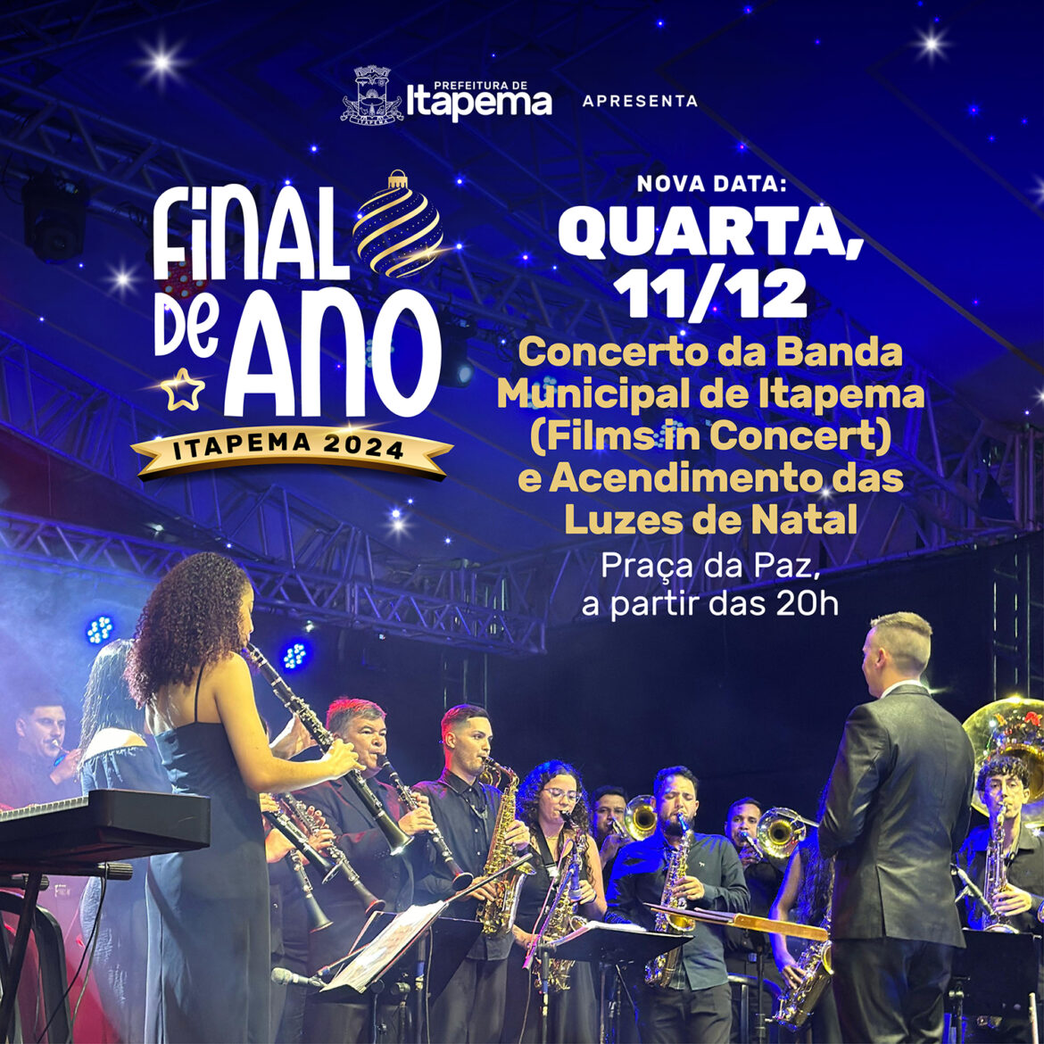 Devido aos alertas emitidos pela Defesa Civil Estadual com previsão de fortes chuvas no final de semana, o Concerto da Banda Municipal e Acendimento Oficial das Luzes de Natal previsto para este domingo (08/12) será realizado na próxima quarta-feira (11/12) na Praça da Paz, a partir das 20h.