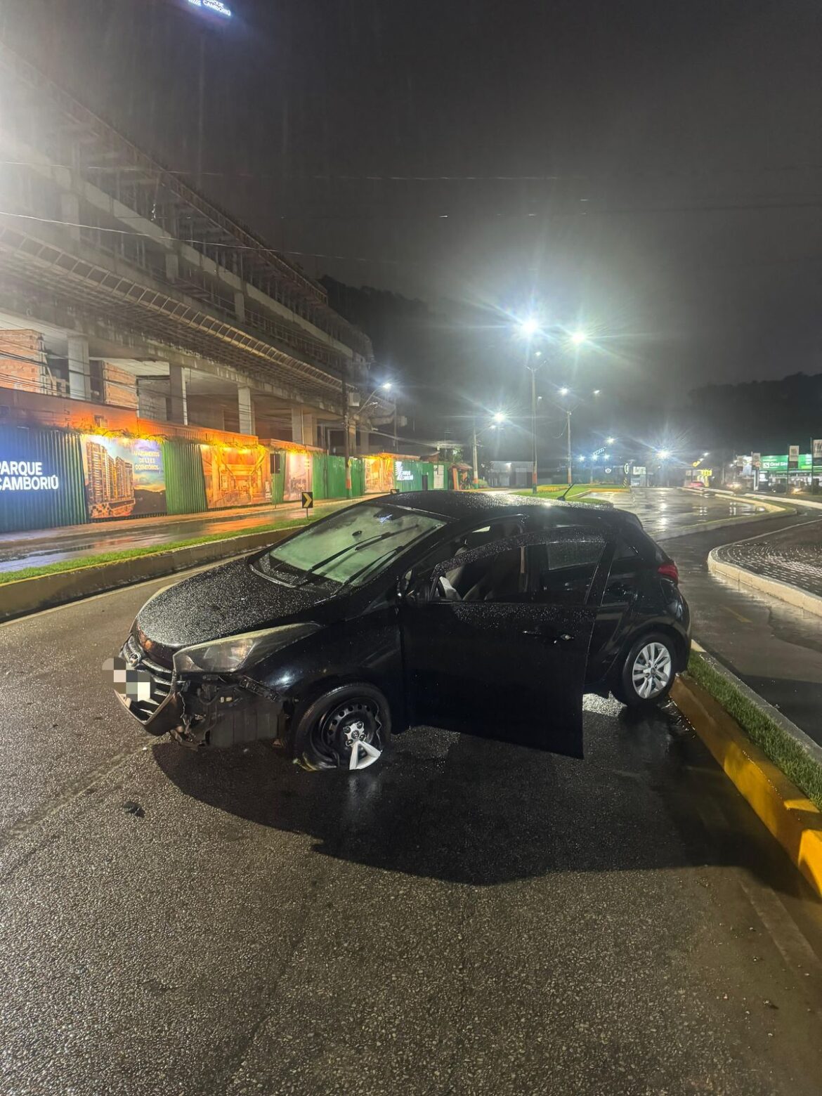 Na madrugada deste sábado (10), uma guarnição da Polícia Militar, durante patrulhamento ostensivo, flagrou um acidente de trânsito na Avenida Santa Catarina, no Centro de Camboriú. Um veículo Hyundai HB20 havia colidido com o canteiro central da via.