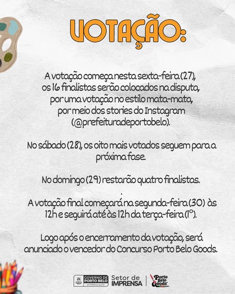 O Governo de Porto Belo, por meio do Setor de Imprensa, informa que houve uma alteração no cronograma da votação dos finalistas do concurso Porto Belo Goods.