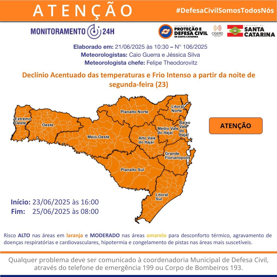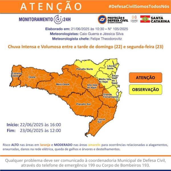 Defesa Civil: (47) 99732-6620 ou 199