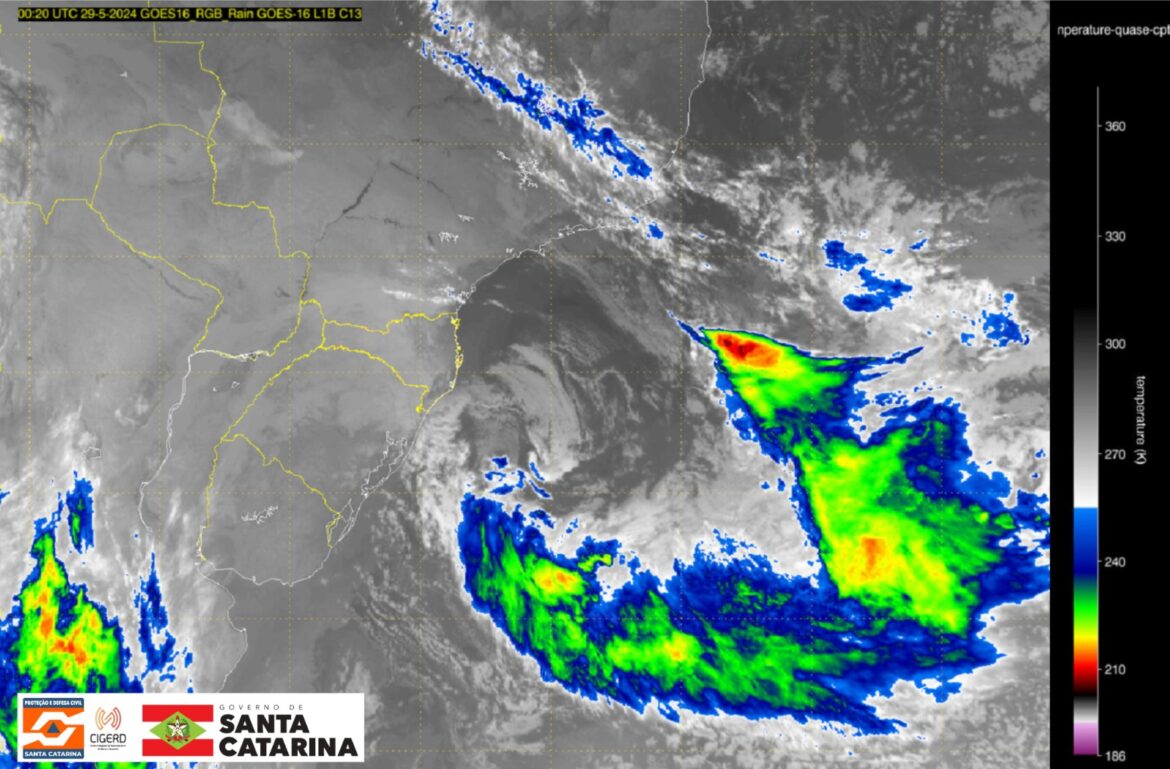 Às 21h, as temperaturas variavam entre 3°C e 8°C no Planalto Sul, 5°C a 12°C no Grande Oeste, Planalto Norte e Alto Vale do Itajaí e de 11°C a 17°C nas demais regiões. Nas próximas horas, a circulação de umidade do ciclone mantém a maior cobertura de nuvens nas regiões anteriormente citadas, inclusive com condição para chuviscos em áreas do Planalto Sul. Nos pontos mais altos da Serra, apesar da precipitação, não há possibilidade de precipitação invernal.