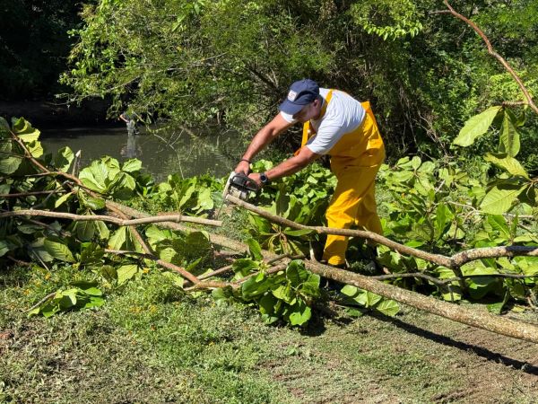 Durante o trabalho, as equipes retiraram galhos, troncos e outros resíduos naturais que estavam presos nas margens e dentro do rio. Esse tipo de material costuma se acumular após ventos fortes ou chuvas, dificultando a passagem da água e comprometendo o fluxo natural do curso d’água.