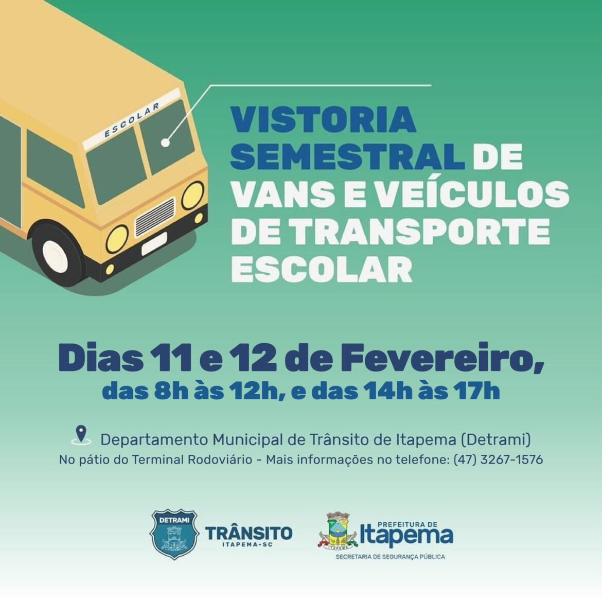 A Secretaria de Segurança Pública, por meio do Departamento de Trânsito Municipal de Itapema (Detrami), informa que a vistoria semestral de vans que executam o transporte escolar será nesta terça-feira (11/02) e quarta-feira (12/02).