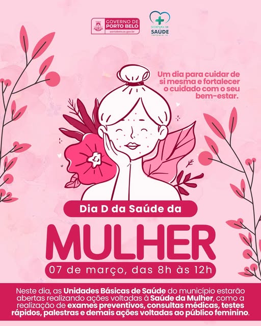 O Governo de Porto Belo promove nesta sexta-feira, 7 de março, o Dia D da Saúde da Mulher, com atendimentos especiais nas Unidades Básicas de Saúde (UBS) do município. A ação acontece das 8h às 12h e é organizada pela Secretaria Municipal de Saúde, com foco na promoção do cuidado e da prevenção entre o público feminino.