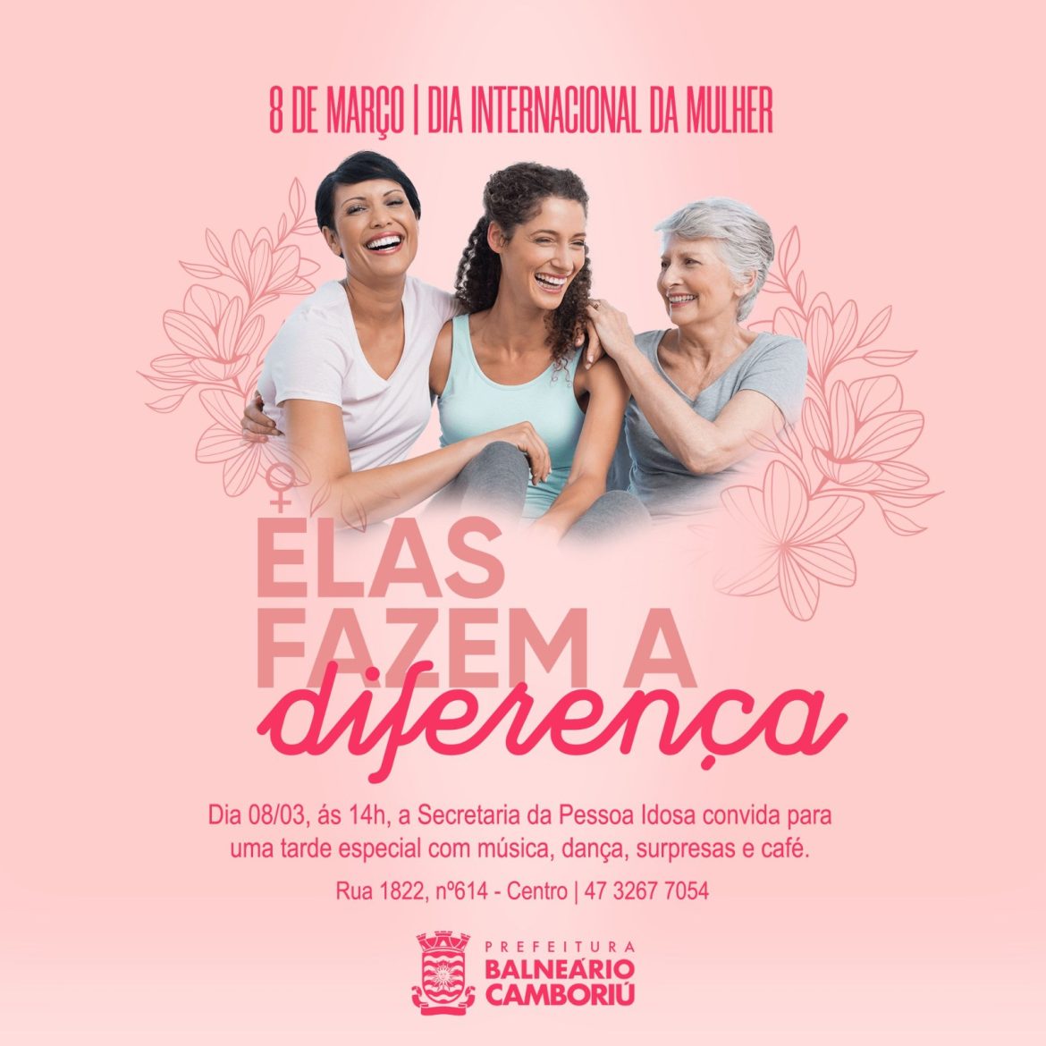A Prefeitura de Balneário Camboriú promove, nesta sexta-feira (08), uma tarde especial para celebrar o Dia Internacional da Mulher. A iniciativa, dirigida ao público 60+ da cidade, acontece na Secretaria da Pessoa Idosa (Rua 1822, nº 614, Centro), a partir das 14h, com entrada gratuita.