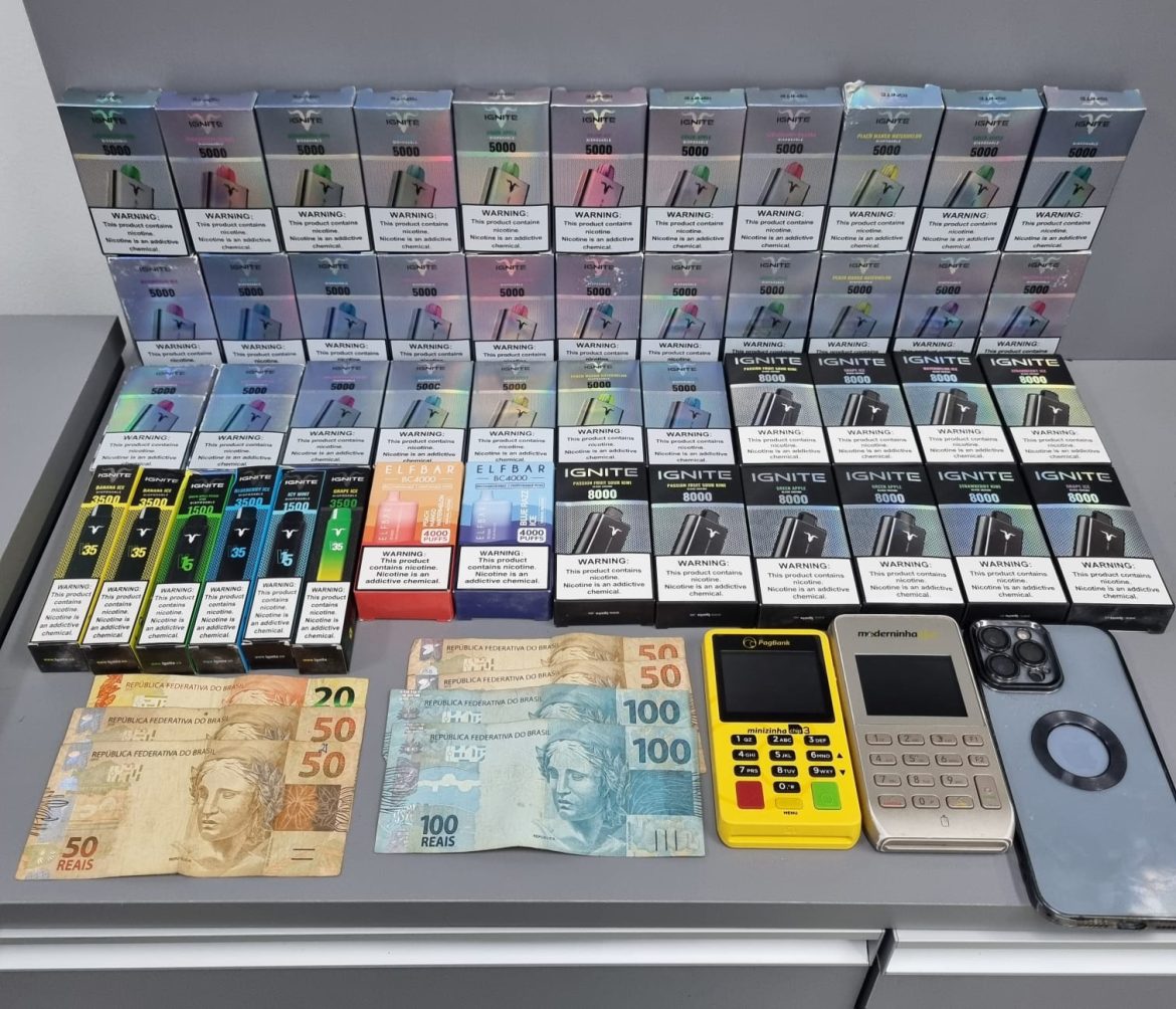 No período da tarde, dois homens foram presos pela comercialização de cigarros eletrônicos em frente a um bar, tendo sido autuados em flagrante por crime contra as relações de consumo.