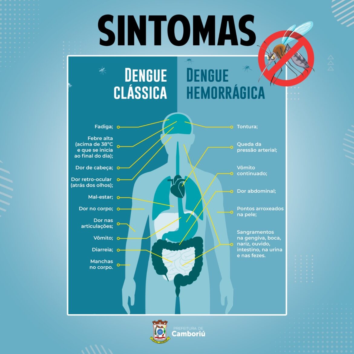 A dengue é um dos assuntos de saúde pública mais abordados nos últimos meses. A crescente no número de casos desperta a atenção da Secretaria de Saúde de Camboriú e também dos moradores. A doença apresenta quadros que podem variar. Os sintomas podem ser “clássicos”, como febre, dores no corpo e manchas; com agravo, que apresenta dor abdominal e sangramentos; ou a doença pode até ser assintomática. Por conta dessas diferenças é importante estar sempre atento à evolução do quadro de cada paciente.