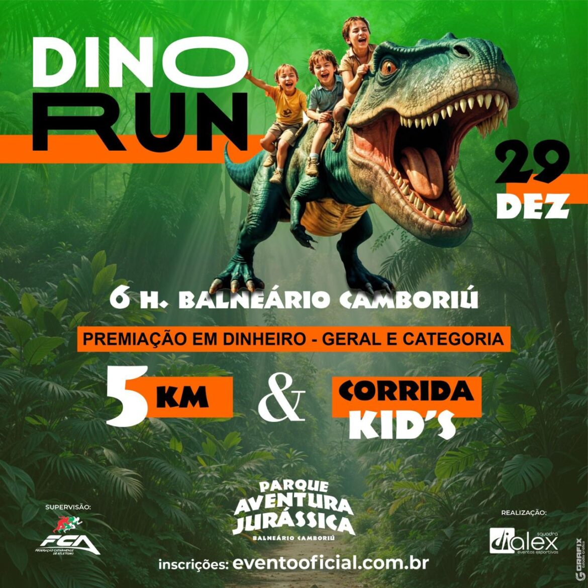 Em uma parceria inédita o Parque Aventura Jurássica e a Squadra Di Alex Eventos Esportivos criaram a DinoRun! Uma corrida de rua em Balneário Camboriú para reunir a família e amigos e encerrar o ano em grande estilo. O parque que tem as maiores réplicas de dinossauros do Brasil será o ponto de partida e chegada dessa aventura que também terá a participação de crianças e idosos! Sim, todos são bem-vindos à DinoRun.