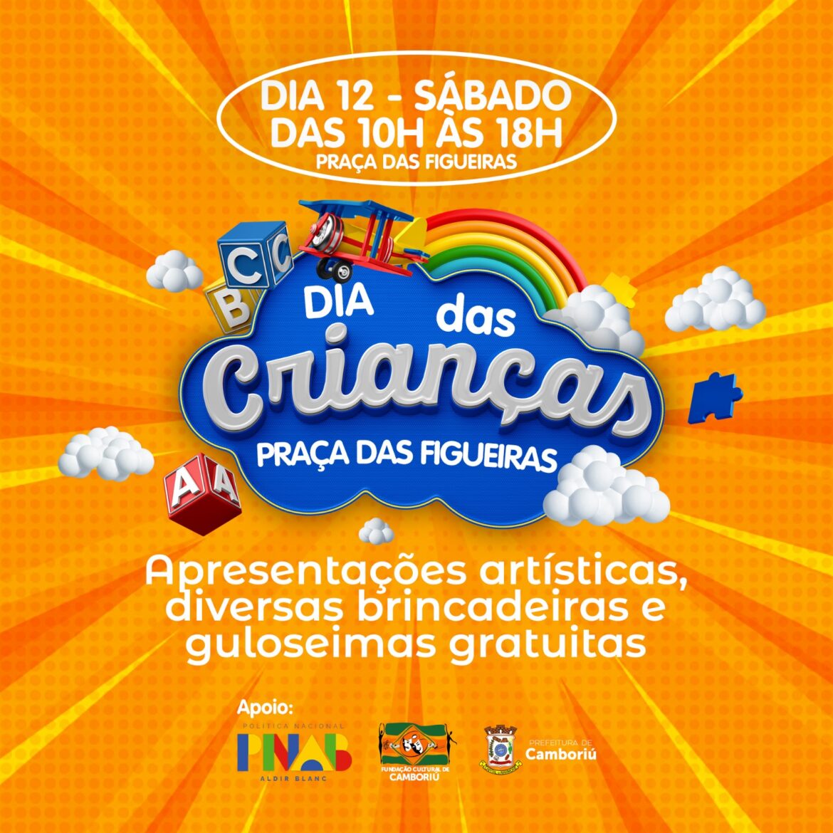 O Dia das Crianças está chegando e não tem nada melhor do que comemorar com muita diversão e brincadeiras. Pensando nisso, a Fundação Cultural de Camboriú irá realizar um evento para o dia das crianças neste sábado, dia 12. A ação será realizada na Praça das Figueiras, localizada na Rua Gustavo Richard, no Centro, das 10h ás 18h e contará com diversas brincadeiras e guloseimas gratuitas, como: cama elástica, tobogã inflável, pipoca, cachorro quente, algodão doce e muito mais.
