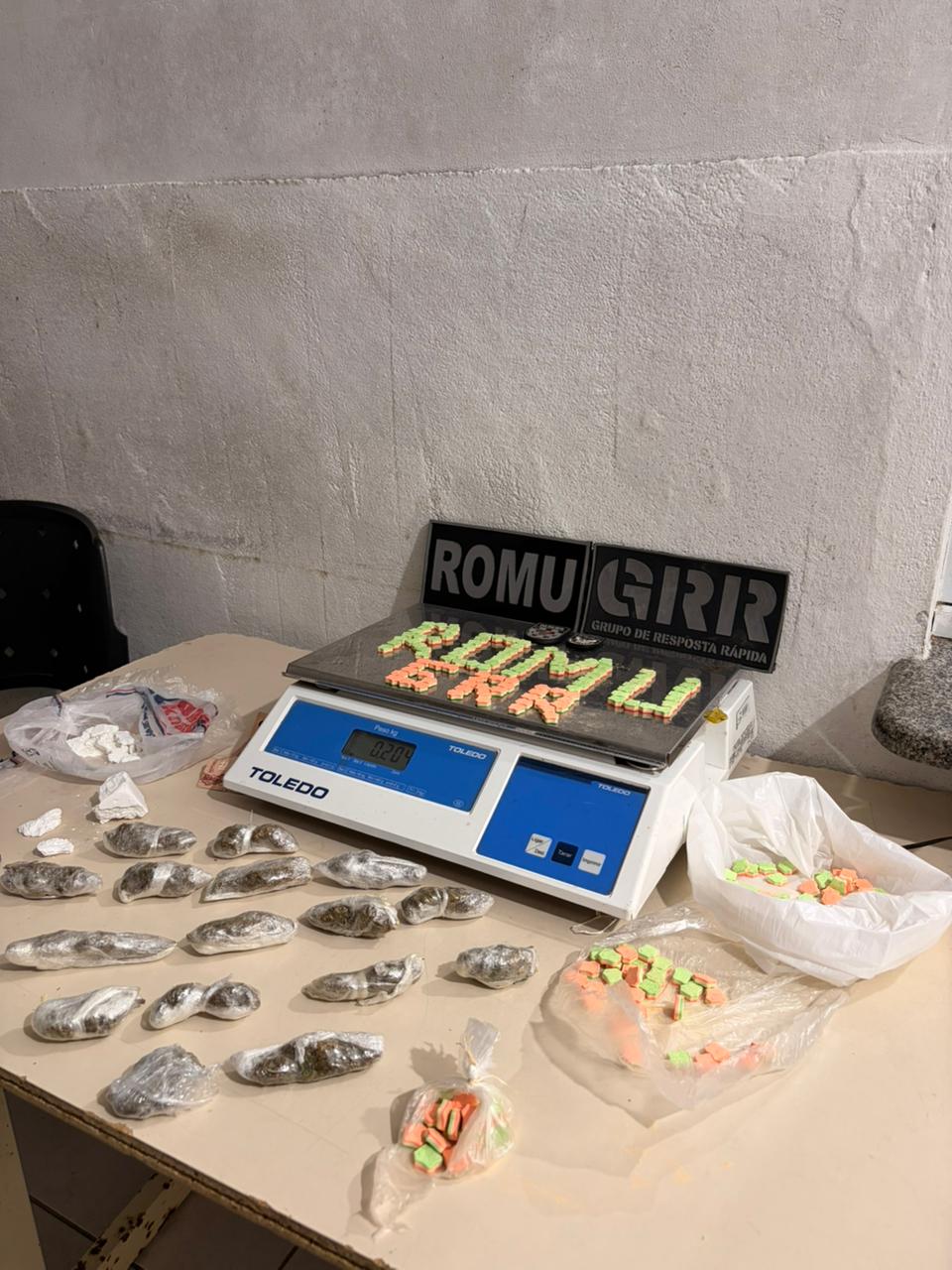 Diante das informações, os policiais se deslocaram até uma residência no bairro Jardim Praia Mar, onde abordaram um segundo homem, já conhecido no meio policial. No local, foram apreendidos 15 invólucros de maconha tipo “flor indoor”, 57 gramas de substância análoga à cocaína, mais 100 comprimidos de ecstasy, uma balança de precisão e um telefone celular.
