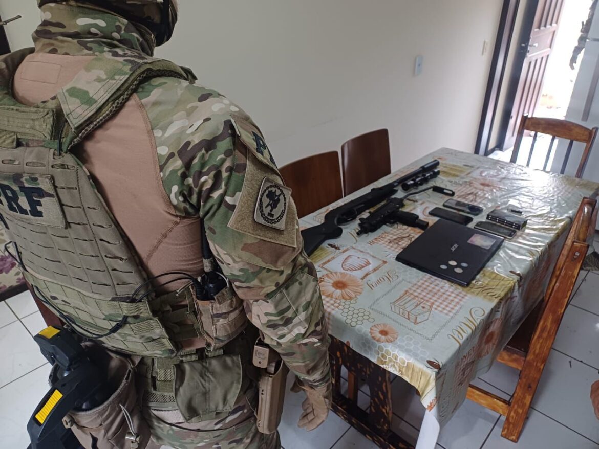 Uma equipe do Núcleo de Operações Especiais (NOE) da PRF capturou o homem dentro de casa. Com ele, os policiais encontraram réplicas de uma metralhadora e de uma espingarda, além de celulares e um computador.