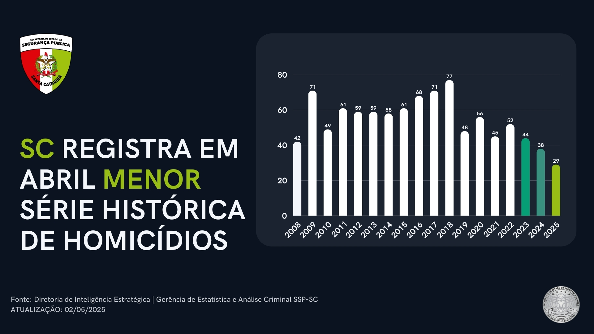 Santa Catarina segue consolidando resultados expressivos na Segurança Pública. Abril de 2025 foi o mês com o menor número de homicídios da série histórica, com 29 casos. Uma queda de 31% em comparação com 2008, primeiro ano de registro, quando foram 42 homicídios. O ano de maior registro foi em 2018, com 77 mortes violentas. Os números são do relatório produzido pela Diretoria de Inteligência Estratégica, com a participação da Gerência de Estatística e Análise Criminal, da Secretaria de Estado da Segurança Pública de Santa Catarina (SSP-SC).